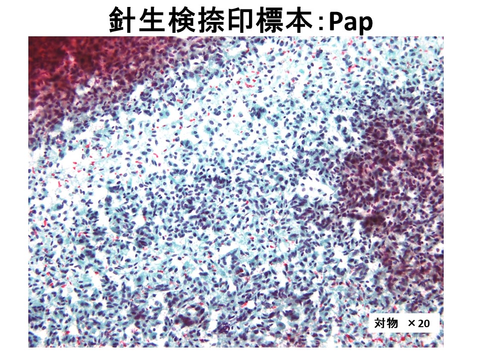 左乳房外側にしこりを自覚。その後、発赤・腫脹ならびに疼痛を自覚し受診。約3cmの腫瘤に対し、針生検を施行した材料の捺印標本。