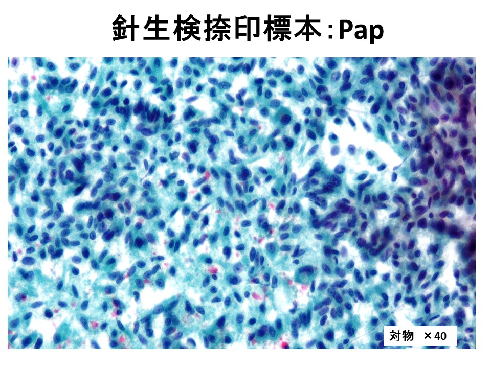 紡錘形の細胞密度の高い腫瘍細胞が認められた。手術材料には梗塞壊死が多く認められた。