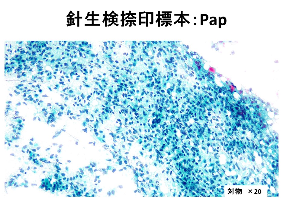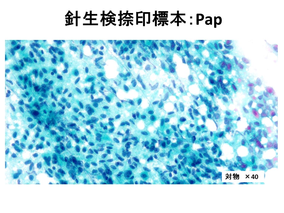 細胞密度が高く、結合性はっきりとしない単調な細胞像。