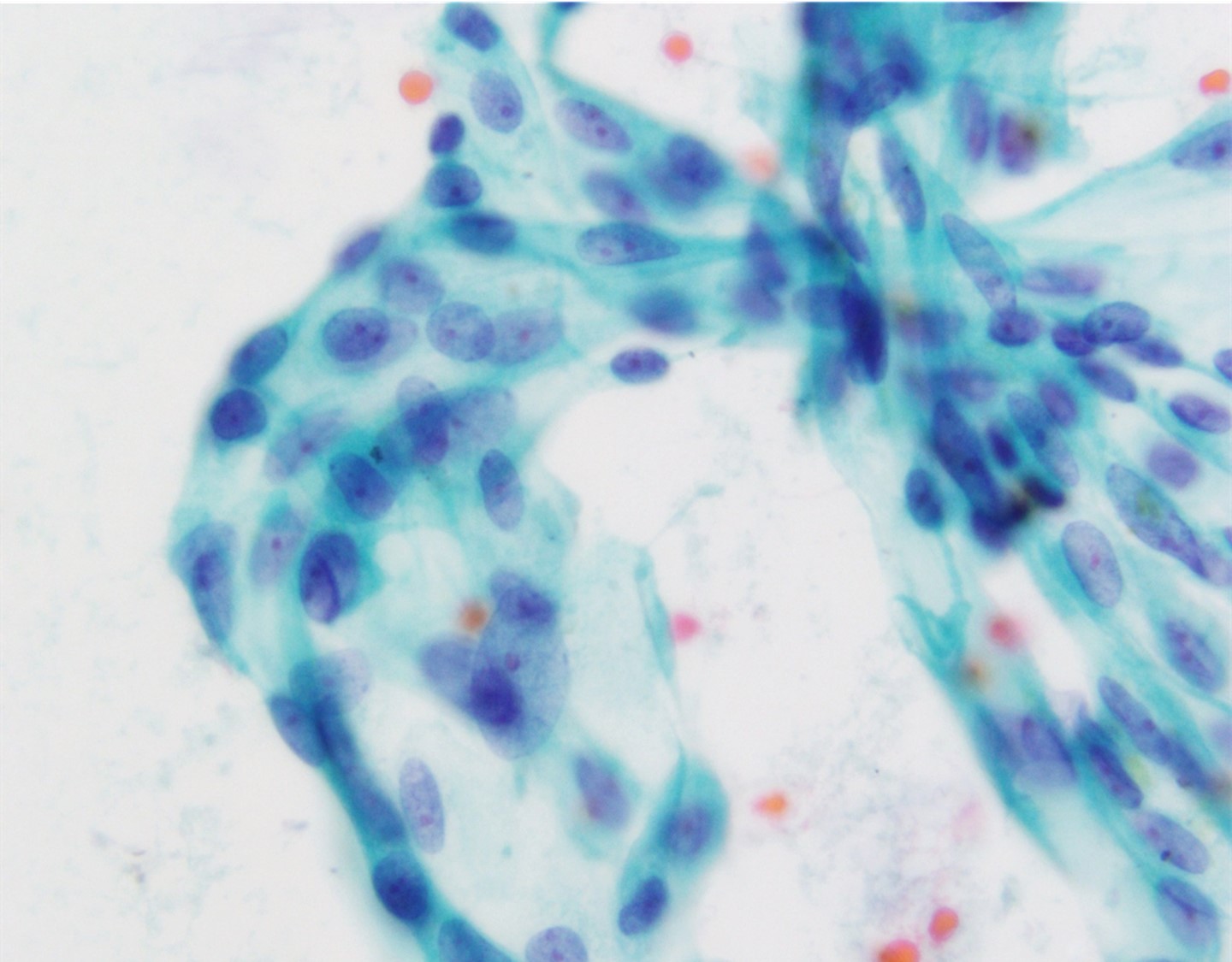 含まれている細胞の核は類円形~楕円形で軽度の大小不同が見られるが, 核クロマチンの増量など核異型に乏しい印象で腫瘍性疾患とも言及し難く, 反応性病変なども鑑別に挙がる.