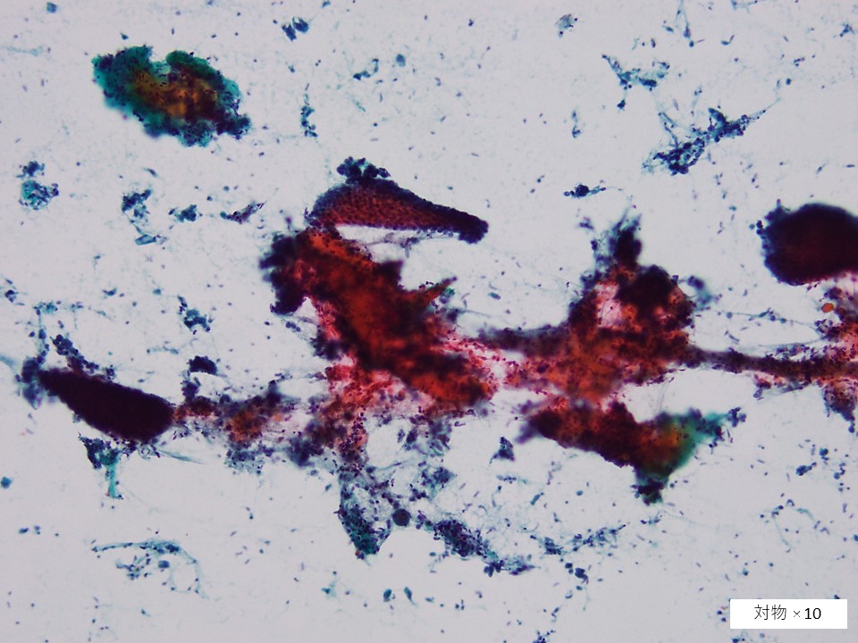 腹部膨満感、不正性器出血を主訴に、精査目的に当院紹介受診。CT画像より、下腹部に23cm大の多房性嚢胞性病変を認め、一部石灰化を伴う充実性成分を伴い、卵巣癌が疑われた。腫瘍摘出術が施行され、摘出された卵巣腫瘍から捺印細胞診を行った。